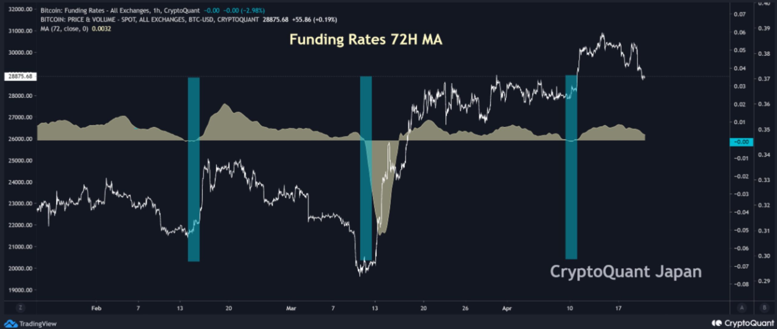 The analyst has identified a pattern where the Bitcoin price starts rising when the metric is near zero within the negative zone. The analyst has marked the relevant portions of the trend in a graph showing the 72-hour moving average (MA) Bitcoin funding rate over the last few months. The chart reveals that whenever the funding rate has just turned negative, the price of Bitcoin has caught some upward momentum shortly after.