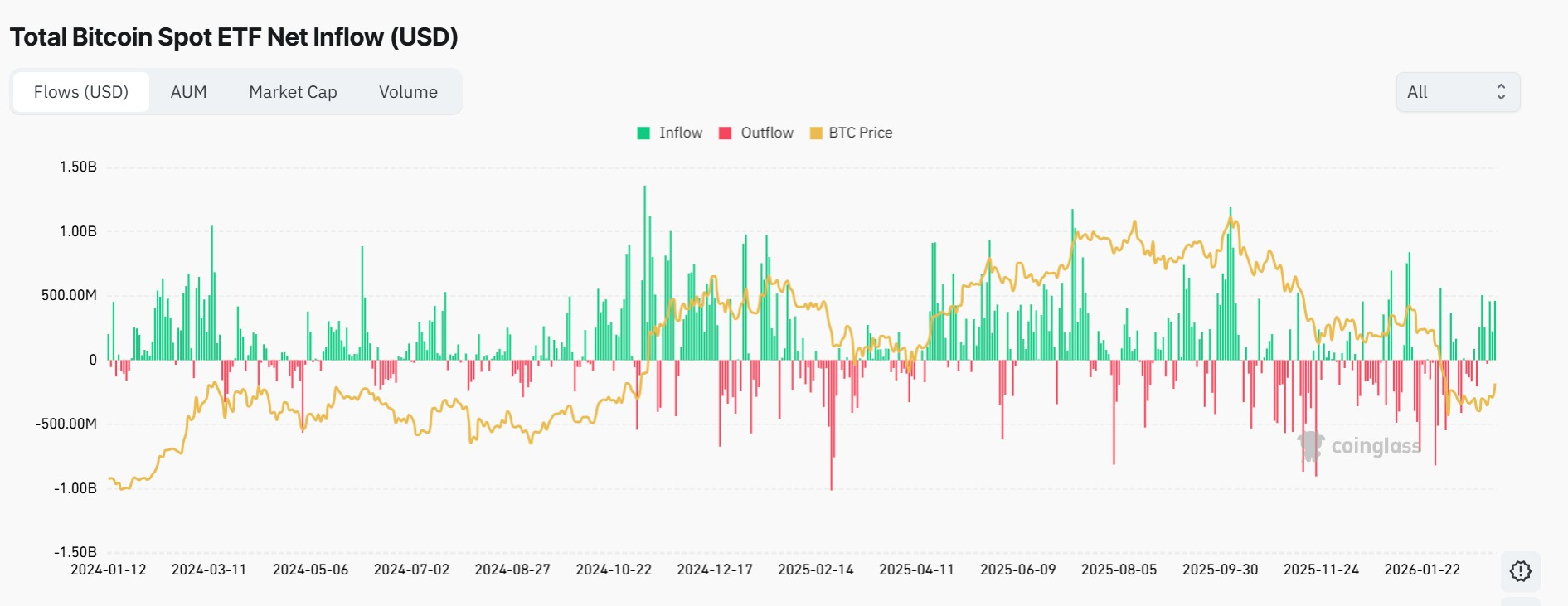 Bitcoin Spot ETF net flows — nine billion out from October through February, then the reversal.