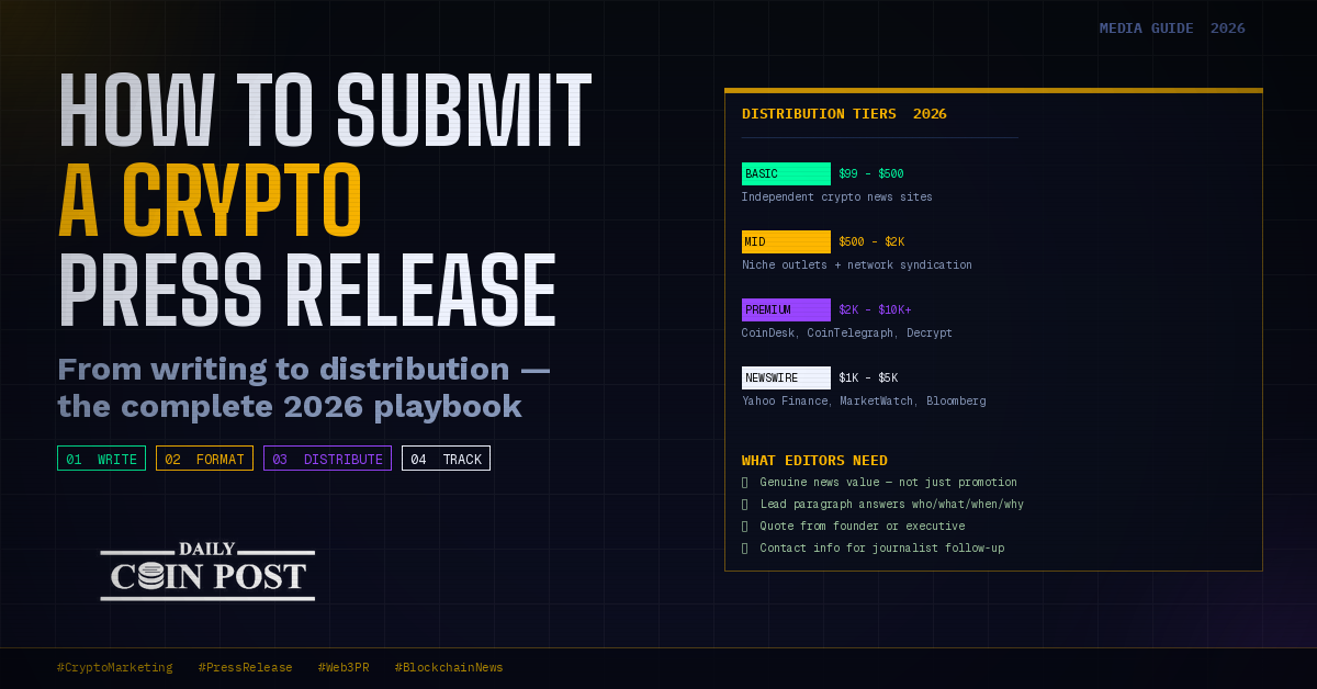 This guide covers everything you need to submit a crypto press release that actually gets read: what to write, how to format it, where to submit it, how much it costs, and what separates releases that get picked up from ones that disappear into the void.