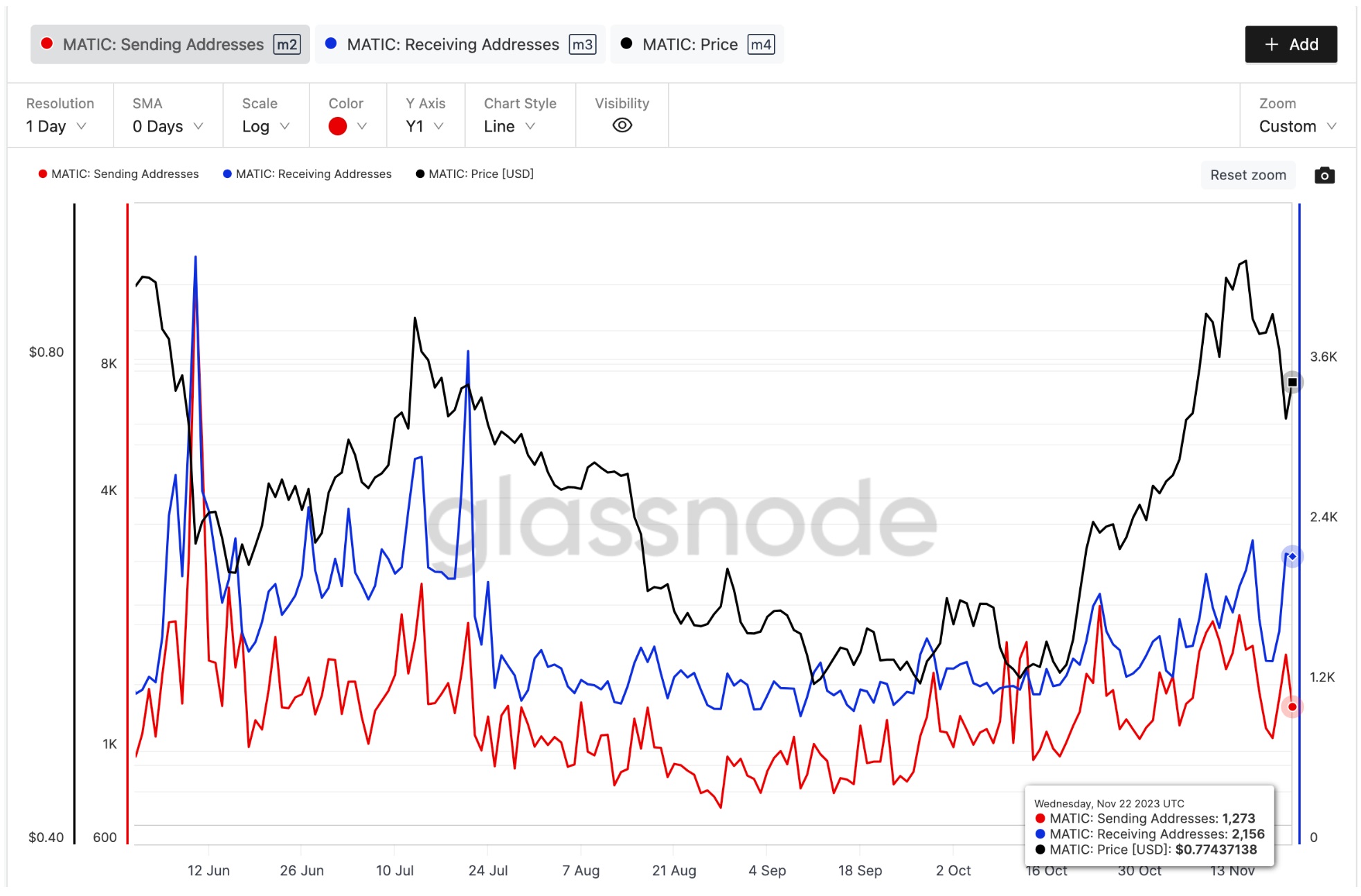The receiving addresses metric reflects the number of unique wallets acquiring the token, while sending addresses represent existing holders actively transferring or selling their holdings. The bullish divergence played a crucial role in MATIC’s 7% rebound from the weekly low of $0.73 on November 21 to $0.78 at the time of writing on November 23.