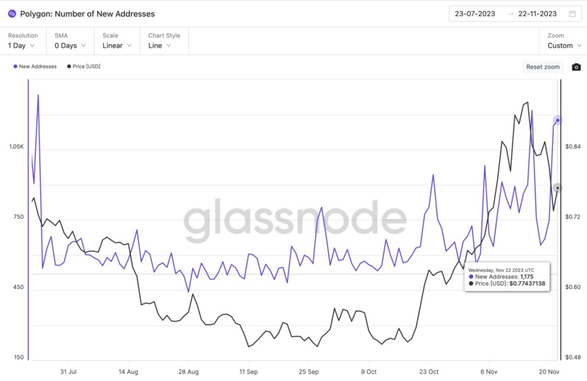 On November 22, the daily creation of new MATIC wallets reached 1,175 addresses, closely trailing the four-month high of 1,217 new addresses recorded on November 16, as per Glassnode’s on-chain chart.